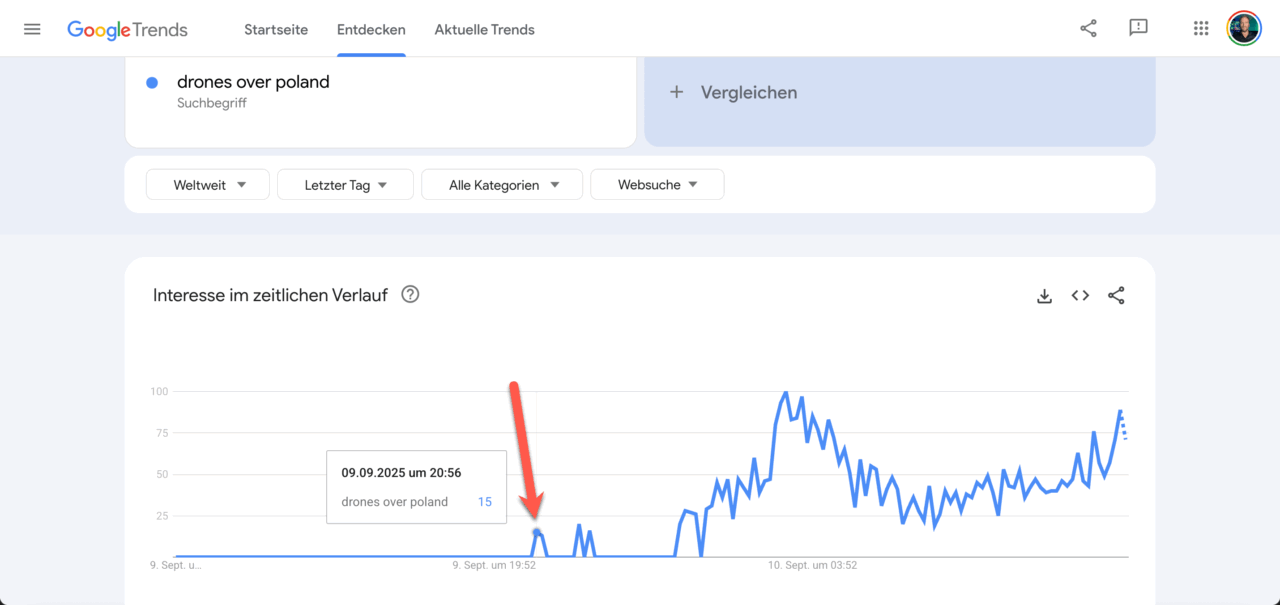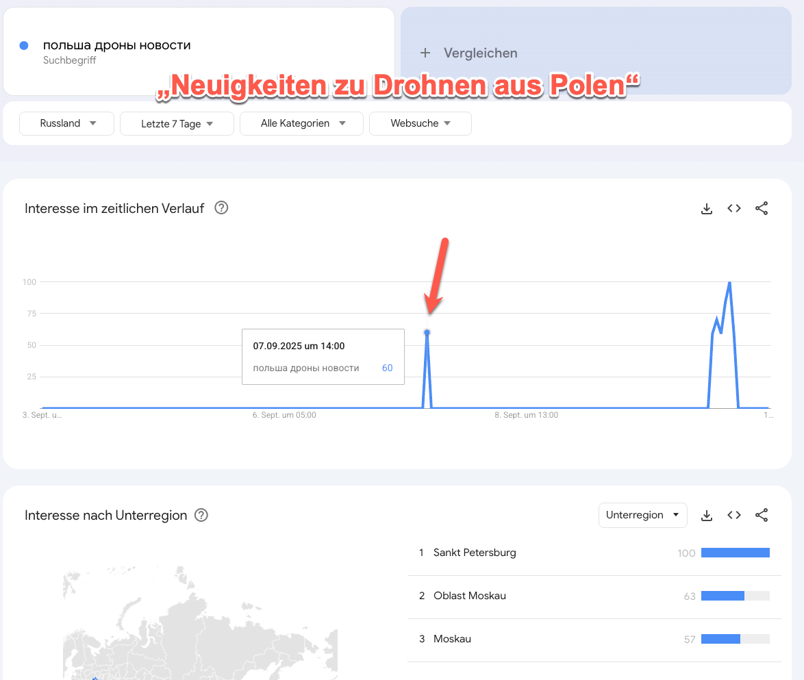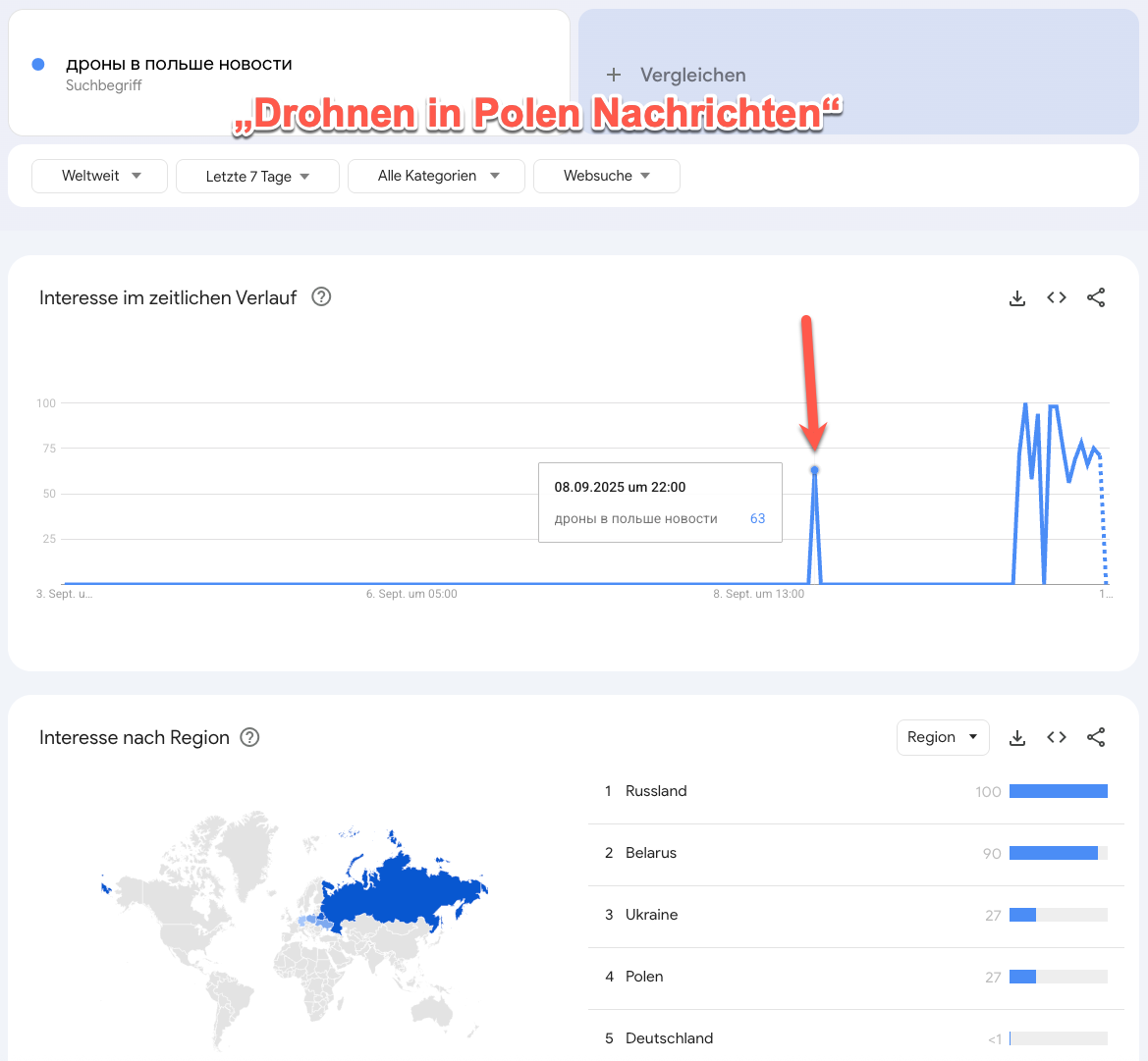 Wer die Trends russischsprachiger Suchanfragen bei Google analysiert, entdeckt bereits am 8. September um 22 Uhr einen deutlichen Peak zum Thema “Drohnen in Polen” – mehr als einen Tag bevor der eigentliche Luftraum-Alarm ausgelöst wurde.